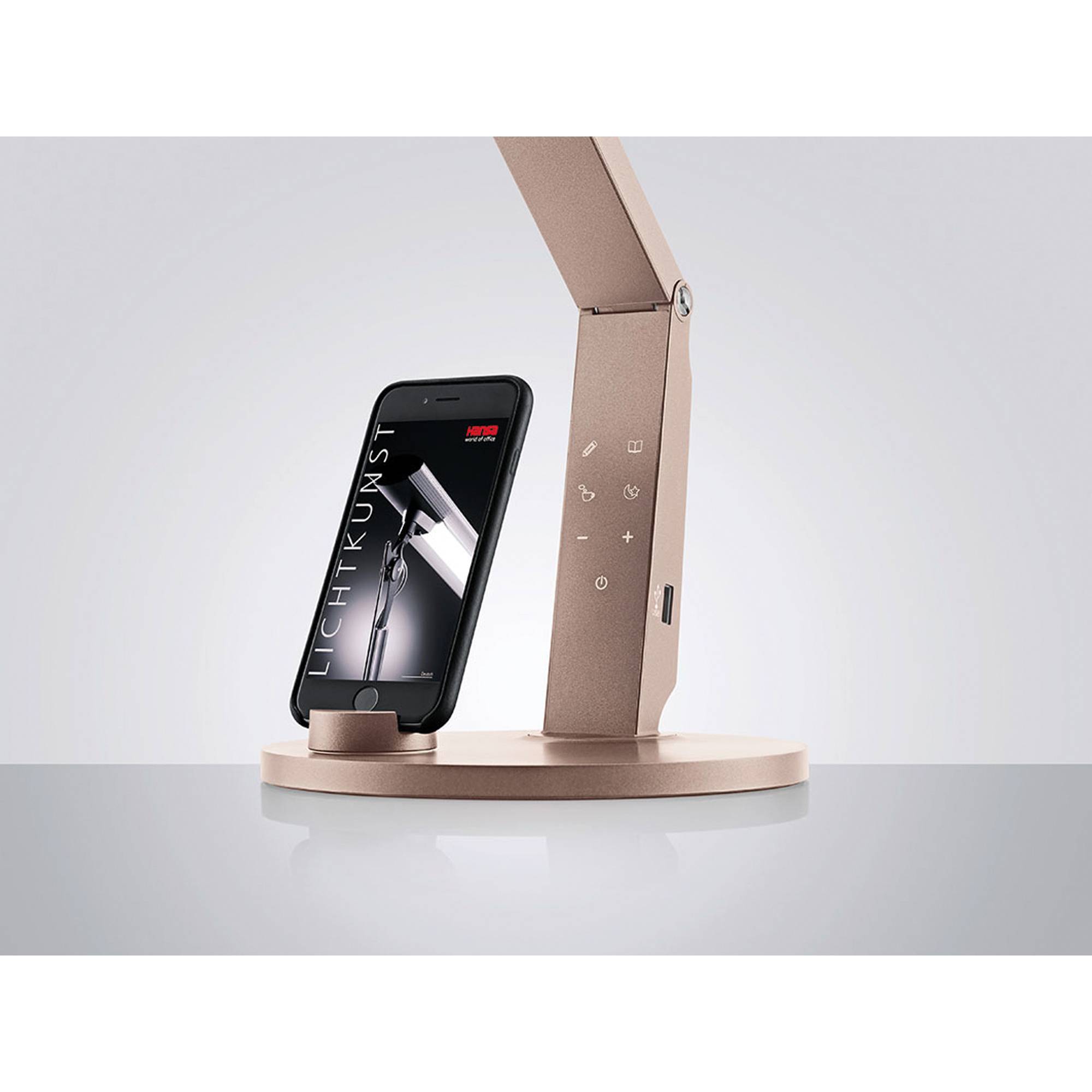 Moderne und multifunktionelle LED Leuchte. 4 verschiedene Stufen der Farbtemperatur wählbar. Mit USB Anschluss (5V, 1.2A) zum Aufladen aller Arten von mobilen Geräten. Leuchte ist um 180° drehbar. Magnetischer Smartphone-Halter kann bei Bedarf an Fuss befestigt werden. Dieses Produkt enthält eine Lichtquelle der Energieeffizienzklasse E und kann nicht ausgetauscht werden.