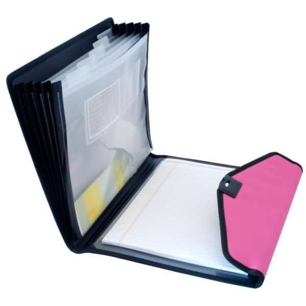 • mit 5 glasklaren Fächern und auswechselbaren Farbschildern zur Bezeichnung des Inhalts, mit Schreibblock und textilverstärkter Kantenumrandung