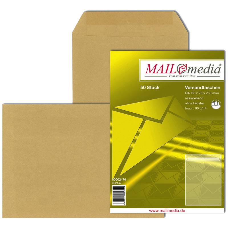 Versandtaschen DIN B5, 176 x 250 mm, nassklebend, braun, 90 g/m², Pack: 50 Stück