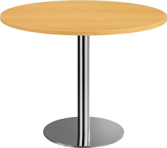 melaminharzbeschichtete Spanplatten nach DIN 68765, Tischplattenstärke 25 mm, mit 2 mm gerundeten Kunststoffkanten · Rundrohr 76 mm, Tellerfuß Ø 500 mm verchromt Weitere technische Eigenschaften: · Ausstattung: Tellerfuß Ø 500 mm verchromt