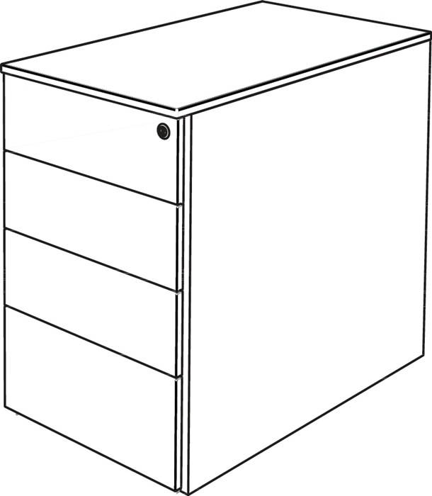 langlebige Melaminharz-Beschichtung · 4 Schubladen mit Auszugssperre, obere Schublade mit Materialschale · höhenverstellbar 720-760 mm · mit Zentralverschluss · Korpus weiß/Deckplatte farbig