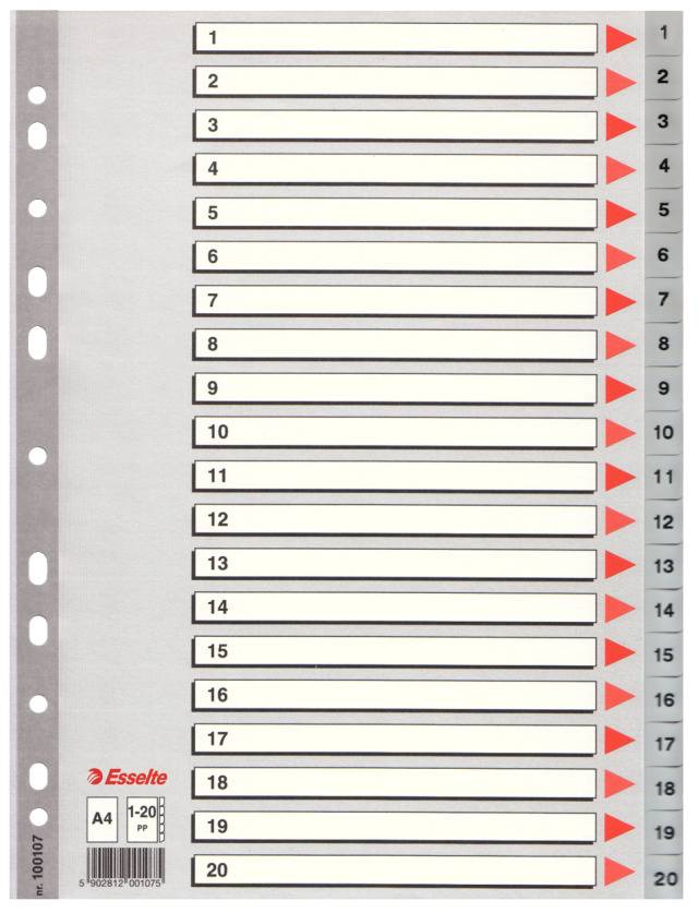 Esselte Plastikregister 1-20, A4, mit Deckblatt, folienverstärktem Lochrand und Universallochung. Material: Polypropylen (PP). Blattanzahl 20. Format: 225 x 297 mm. Farbe: grau.