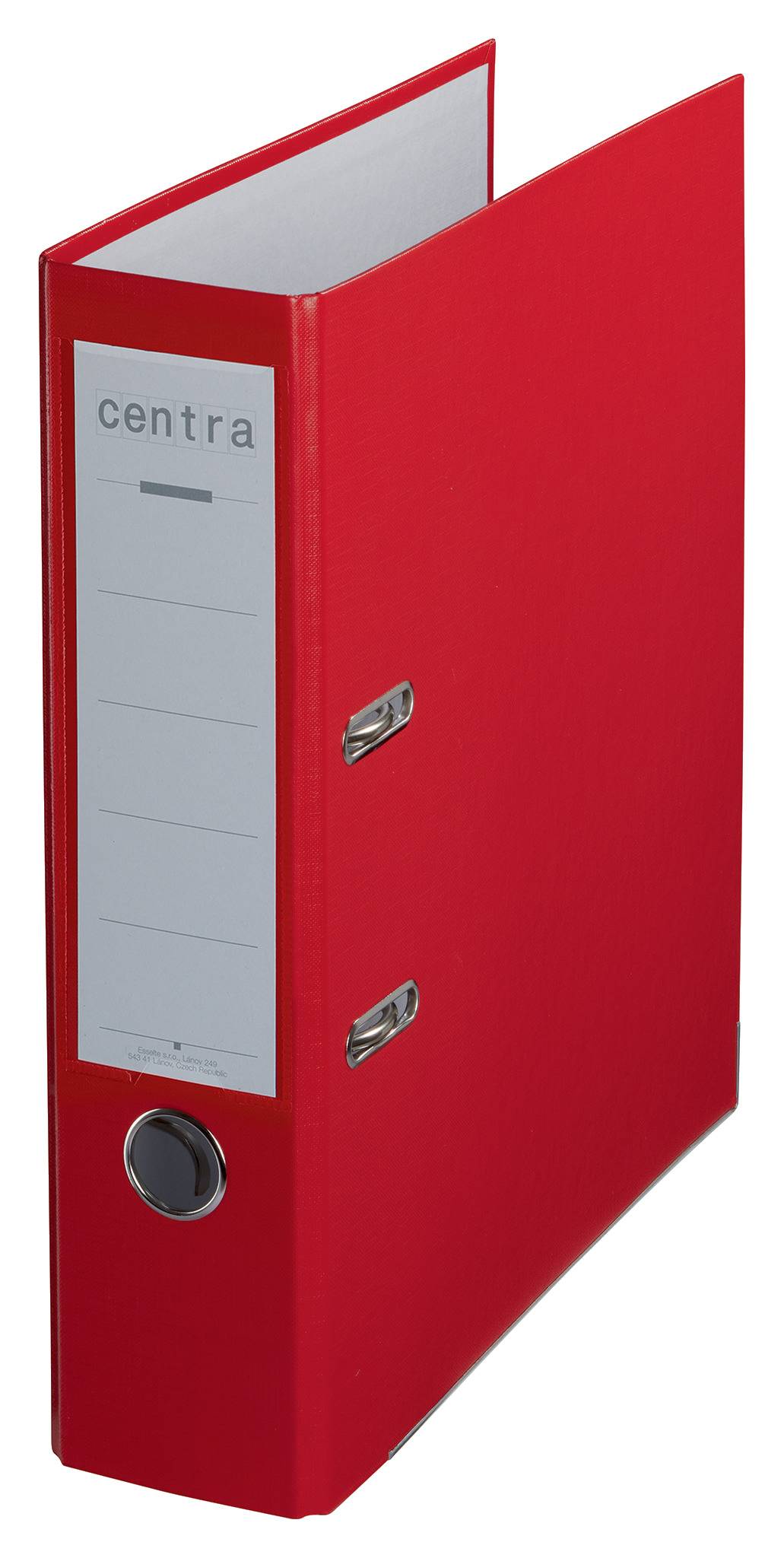 Centra Ordner Plastik Chromos, mit Hebelmechnik. Mit Schlitzen, mit Griffloch, mit Kantenschutz, mit Sichttasche am Rücken und auswechselbarem Rückenschild. Material: Einband mit umweltschonender Polypropylen-Folie kaschiert, innen Polyethylen-beschichtetes, graues Papier. Format: für A4, 317 x 285 mm, Rückenbreite: 80 mm. Farbe: rot.