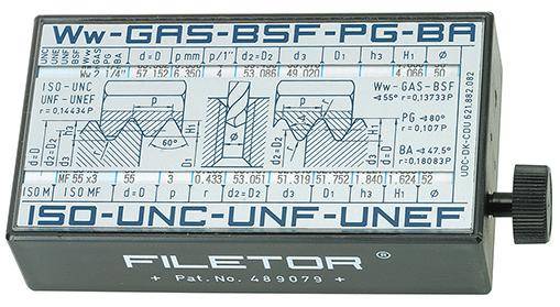Anzeigegerät, Filetor ISO-Gewindeanzeiger Filetor. Zum Ablesen aller Bestimmungen eines Gewindes. Merkmale: Marke: FORMAT WGNr.: W447 Ausführung: Filetor Maße: 60 x 30 x 110 mm