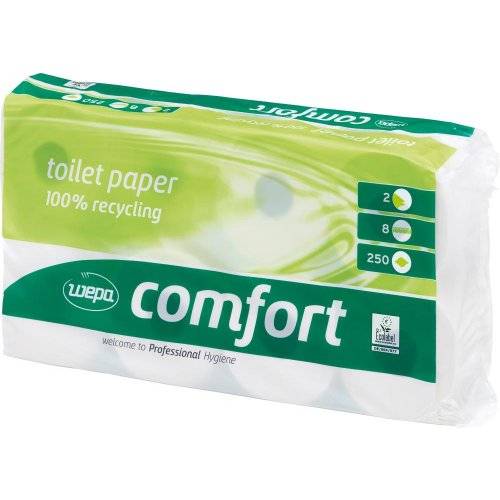 Toilettenpapier WEPA Comfort• Hochwertiges Tissue-Toilettenpapier aus 100 % Altpapier • 2- oder 3-lagig • Farbe: hochweiß 2-lagig: 8 Einheiten/VE, 33 VE/Palette 3-lagig: 8 Einheiten/VE, 18 VE/Palette. Papierlagen 2 Blatt pro Rolle 250 Flächen-Prägung Waffelprägung Paketinhalt 64 Rollen (8x8) Paletten-Menge 33 Pakete = 2112 Rollen