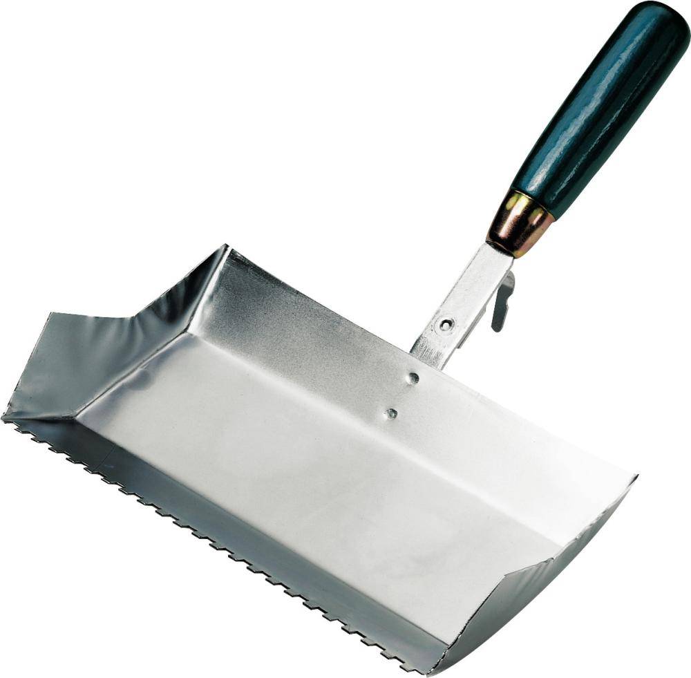 Klebekelle Nr. 870 • Blatt und Hals aus Stahl, verzinkt • Zwinge galvanisiert • 2-fach lackiertes Buchenholzheft • Mit Eimerschlaufe • Für Gasbetonkleber