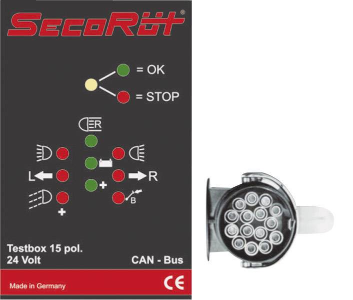 Mit der microprozessorgesteuerten Prüfbox können alle 15pol. N+S Anhängersteckdosen mit 12 und 24 V überprüft werden. Die Prüfbox ist auch für Fahrzeuge mit neuester CAN-Bus-Technologie ausgelegt. Das übersichtliche Design ermöglicht schnelle Fehlererkennung an der Anhängersteckdose. Die Belegung der Steckdose wird nach DIN/ISO 12098 überprüft und es werden zusätzlich die Masseanschlüsse (Minus) angezeigt. Durch das 10 m lange Prüfkabel kann die Prüfung bequem vom Fahrersitz aus durchgeführt werden.
