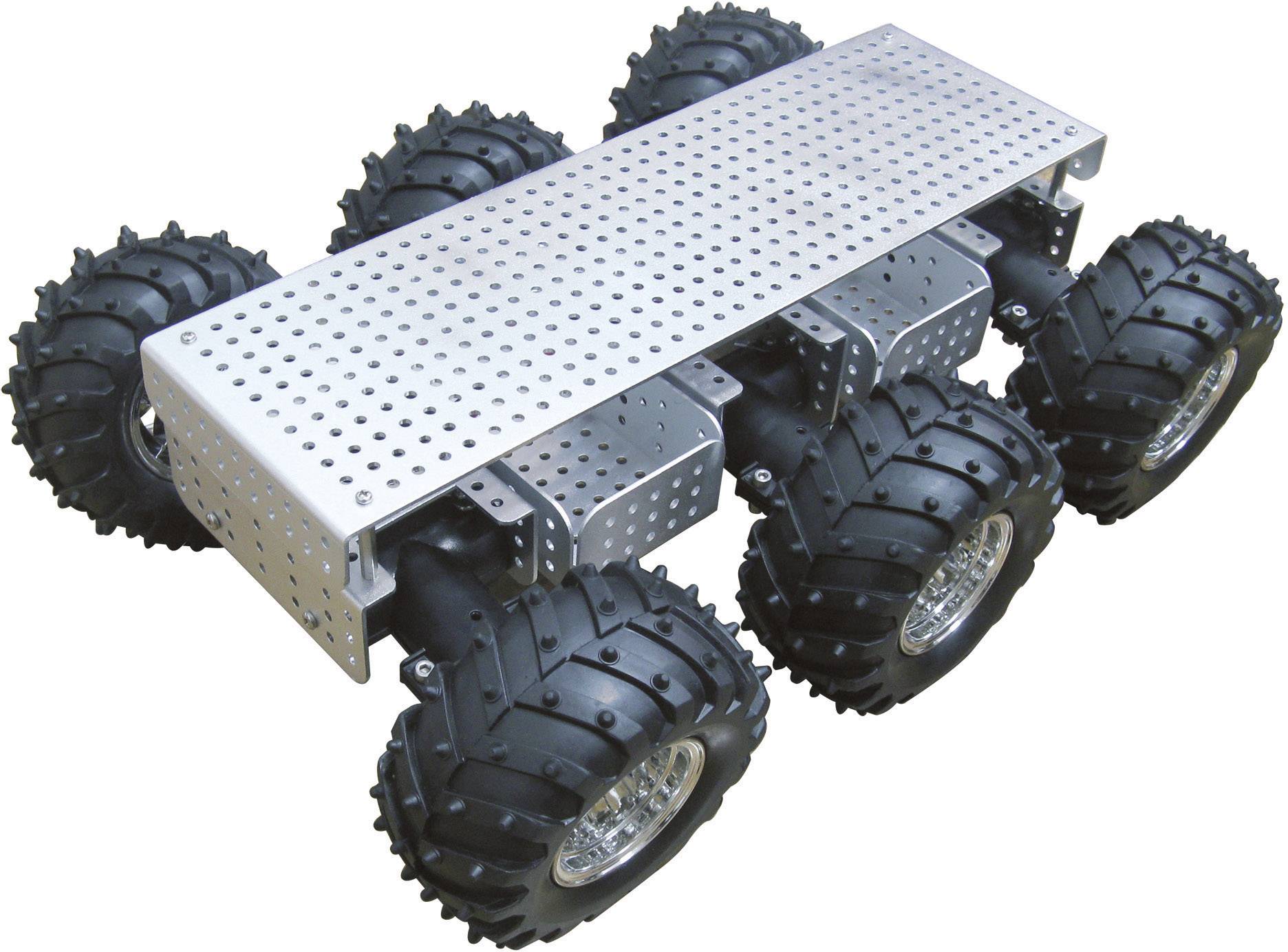 Korrosionsbeständiges, anodisiertes Aluminiumgehäuse · Einstellbare "Supertwist"-Radaufhängung · Riesige Gummireifen mit griffigen Stollen · 6 leistungsfähige Motoren mit Stahlboxgetrieben · 2 Batteriebehälter für 7,2 V sub C Batteriepakete · Geräumiges Oberdeck zur Unterbringung der Verkabelung und Aufbauten.