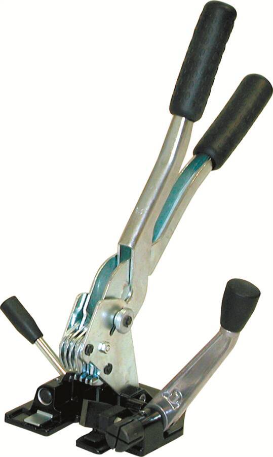 universelles manuelles Umreifungsgerät, Spann- und Verschlussfunktion in einem Gerät, Bandspannung erfolgt durch die direkte Krafteinwirkung des Anwenders, automatische Bandabtrennung während des Verschlussvorgangs durch Schafottmesser