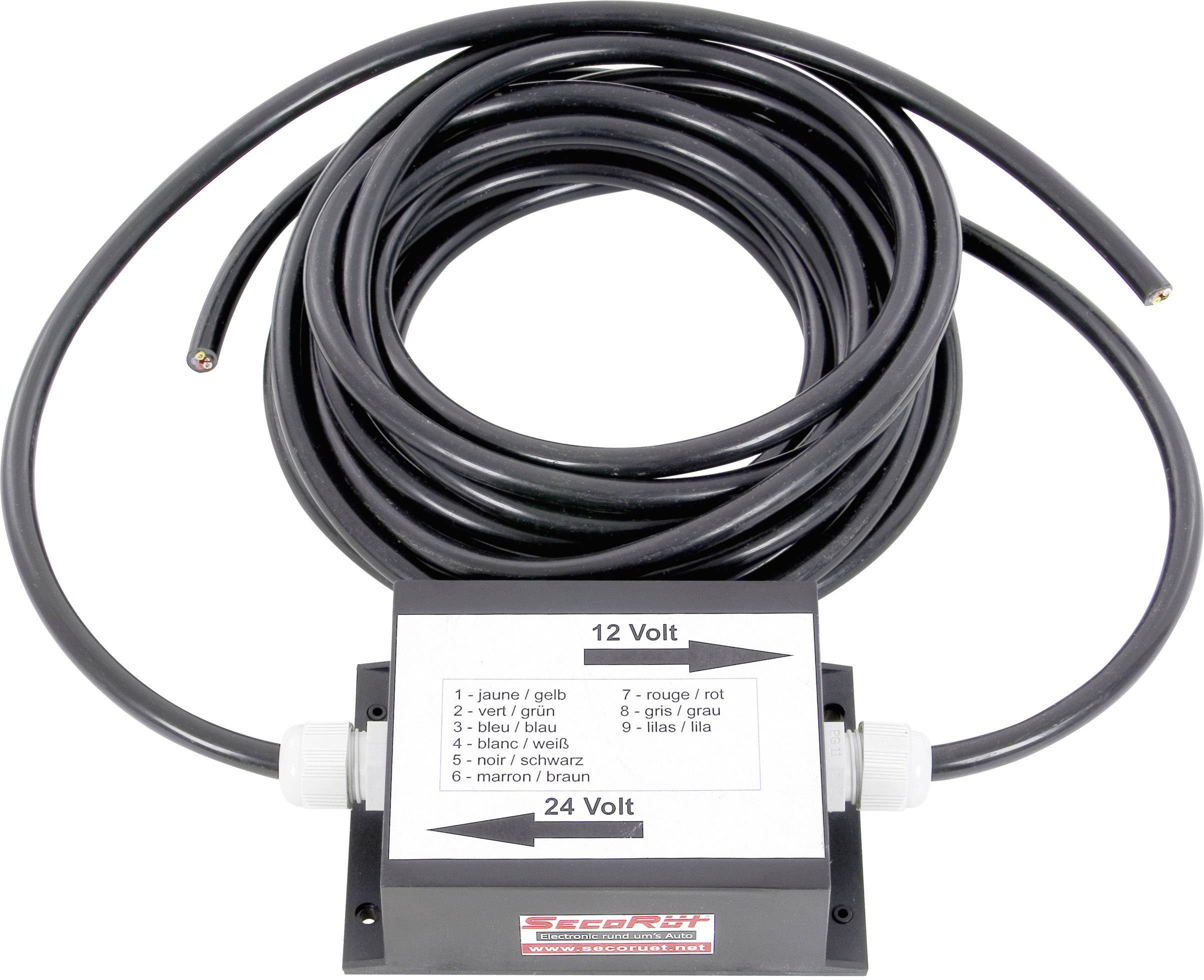 0,5 m Kabel Eingang 24 V und 3,0 m Kabelausgang 12 V · Gehäuse IP64 geschützt + Steckdose mit Dichtung PKW 7pol. · Flexible Kabel 1 mm² · 60 W pro Leitung belastbar