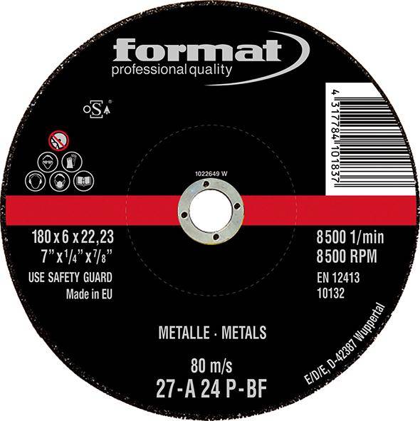 Schruppscheibe für Stahlbearbeitung, Format Ausführung: Korund (A 24), hart, mit faserstoffverstärkter Kunstharzbindung für hohe Standzeiten und Schleifleistung. Normbohrung 22,23 mm. Anwendung: Für den universellen Einsatz in der Metallbearbeitung. Merkmale: Marke: FORMAT WGNr.: W820 Ausführung: gekröpft max. Drehzahl: 8500 min-1