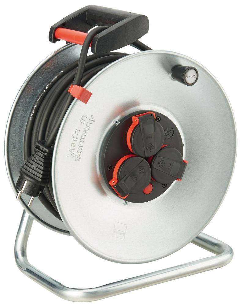 Kabeltrommel, Stahlblech, Gummi | Robuste Ausführung Aus rostgeschütztem, verzinktem Stahlblech. Stabiles Tragegestell. | 3 Schutzkontakt-Steckdosen Spritzwassergeschützte, selbstschließende Deckel. | Überhitzungsschutz Kontrollleuchte leuchtet bei Überh