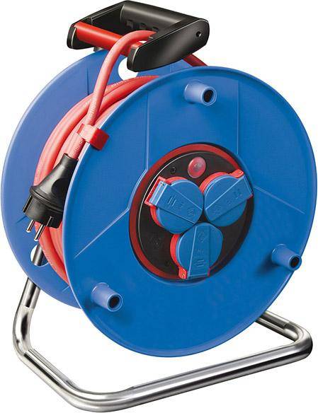Kabeltrommel, Typ Gummi H05 RR-F 3G1,5 | Besonders robust Hochfester Spezialkunststoff. Verzinktes Tragegestell. | 3 Schutzkontakt-Steckdosen Spritzwassergeschützte, selbstschließende Deckel. | Überhitzungsschutz Kontrollleuchte leuchtet bei Überlastung.