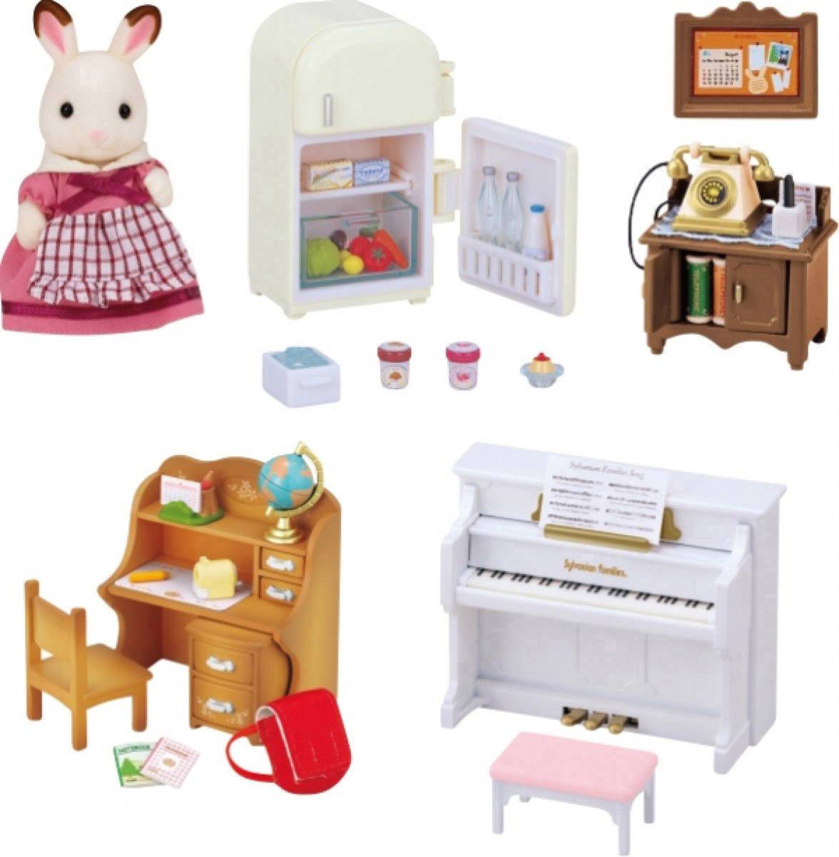 Mit diesem wohnlichen Einrichtungsset verwandelst du dein Starter-Haus, von einem Haus in ein gemütliches Zuhause. Mit der Schokoladenhasen Mutter in schicker Schürze, beinhaltet dieses Set alles, um etwas Glanz ins Kinderzimmer zu bringen. Ein Pult, Briefpapier wie auch das, was du in einer gemütlichen Landhausküche brauchst- ein Kühlschrank mit frischen Zutaten. Sogar ein Telefon und Klavier für das Sylvanian Wohnzimmer sind enthalten.