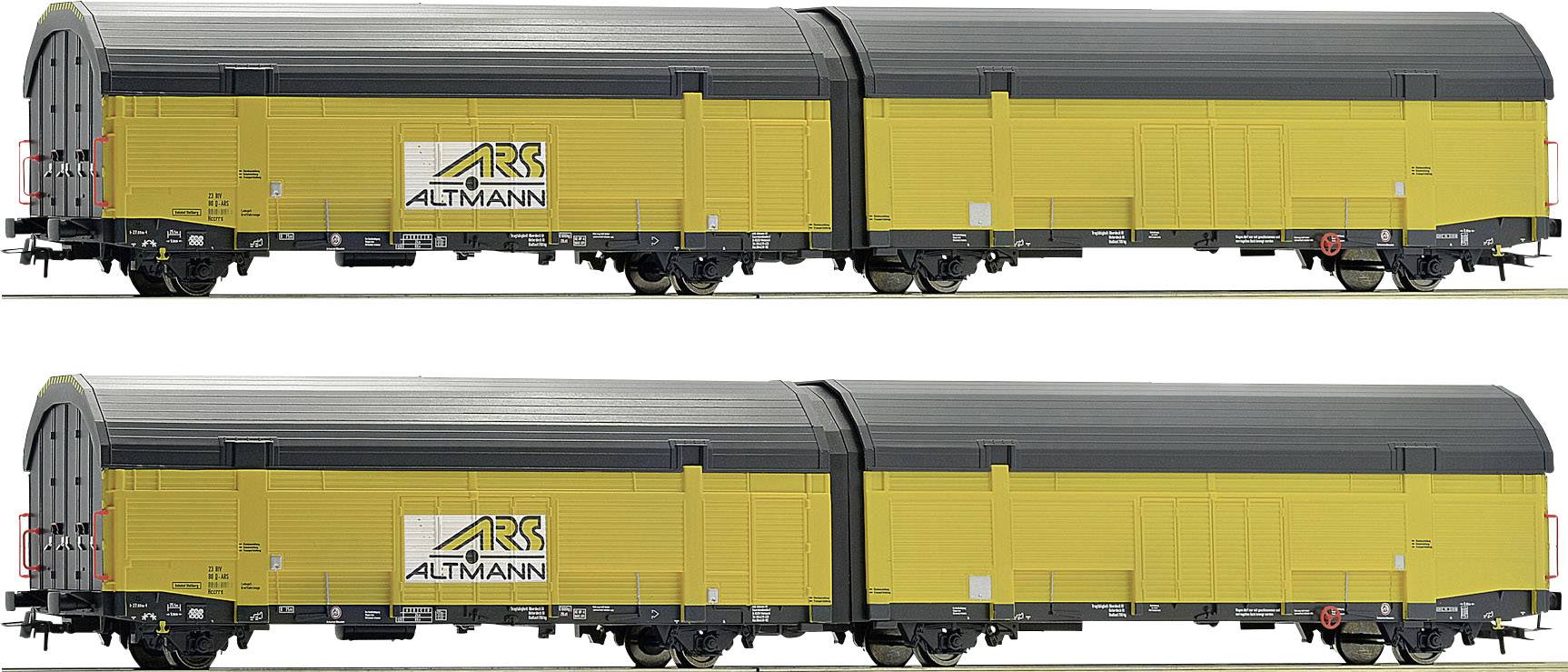 Set bestehend aus zwei geschlossenen, doppelstöckigen Güterwagen-Einheiten, Bauart Hccrrs, für den Autotransport der Firma ARS Altmann.