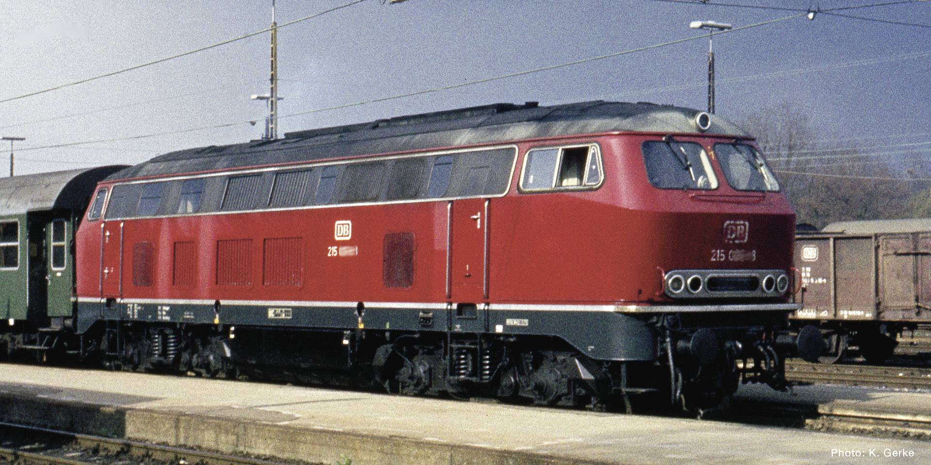 Diesellokomotive Baureihe 215 der Deutschen Bundesbahn in altroter Lackierung im Ursprungszustand.