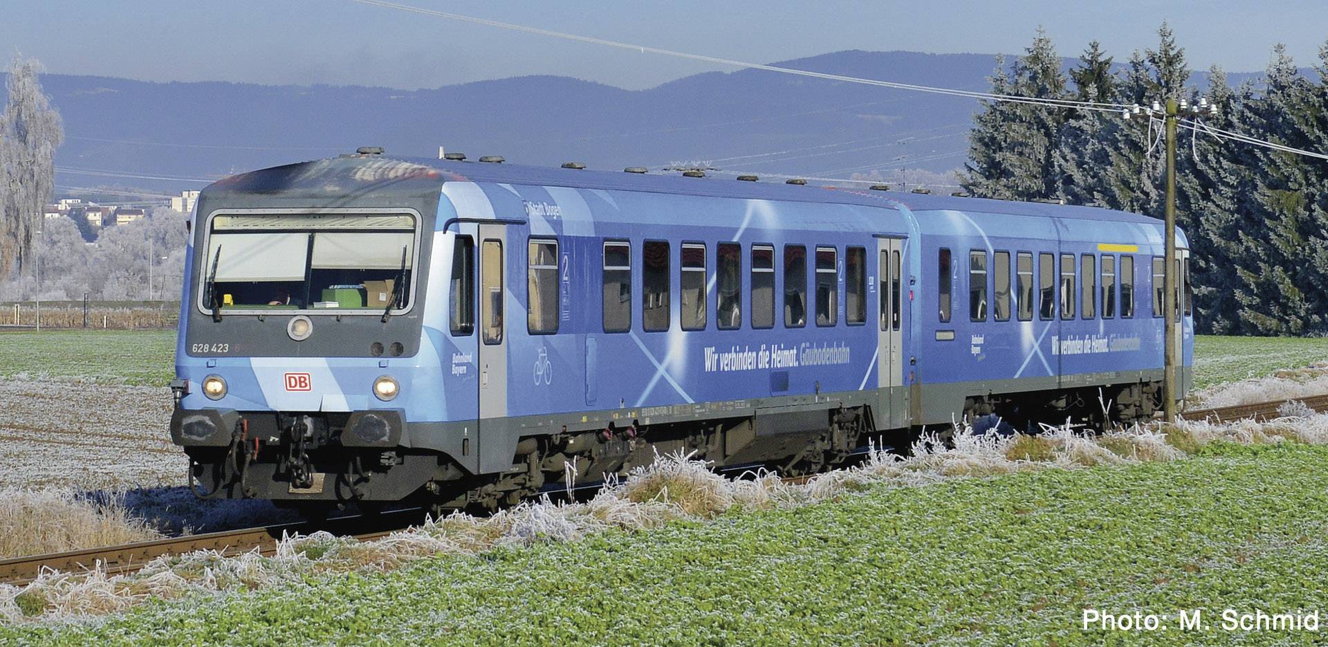 Dieseltriebzug Baureihe 628.4 der Deutschen Bahn AG im „Bahnland Bayern“-Design.