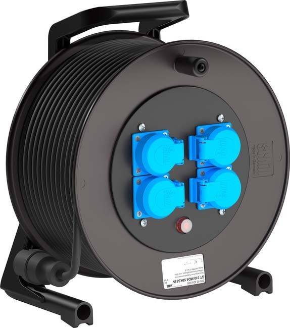 Gummi-Kabeltrommel mit 4 Maschinensteckdosen 2P + E, mit Hammerzeichen, Aderquerschnitt 1,5 mm2, Ader-Zahl: 3, 4 Schutzkontaktsteckdosen (Typ F), 50 m Leitung, mit Tragrahmen, Arretierung, thermischer Schutz