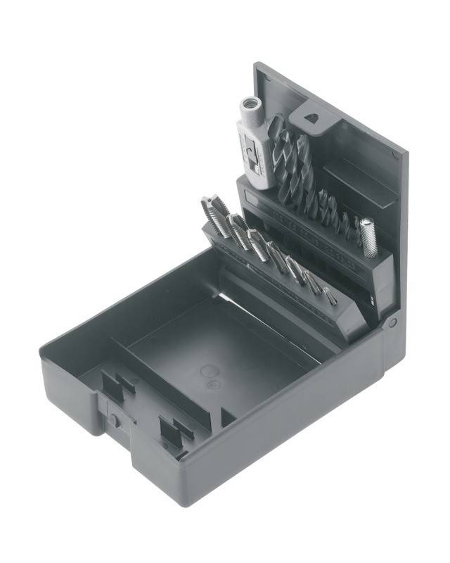 HSS-Gewindebohrer DIREKTSCHNEIDERE-Einschnittgewindebohrer DIN 352/B mit Schälanschnitt, für metrisches Regelgewinde, in Kunststoffkassette je 1 Stück Gewindebohrer M 3 - 4 - 5 - 6 - 8 - 10 - 12 je 1 Stück HSS-Spiralbohrer (Kernlochbohrer) 2, 5 - 3, 3 - 4, 2 - 5, 0 - 6, 8 - 8, 5 - 10,2 mm