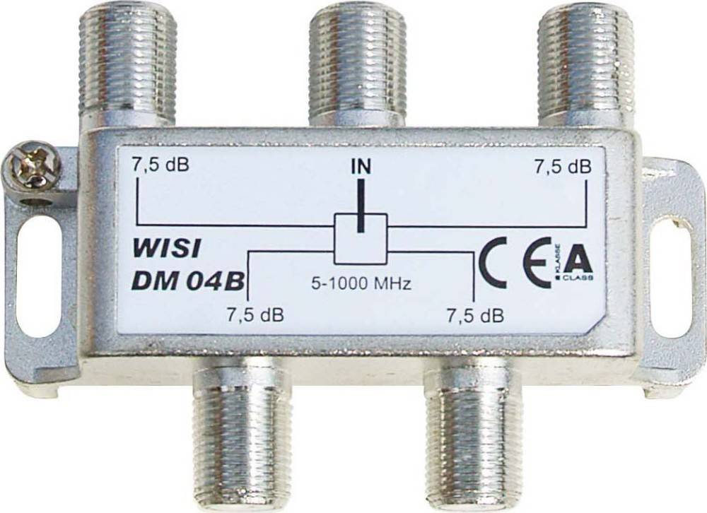 Der DM04 B ist ein 4-fach Verteiler der die symetrische Aufteilung von Kabelsignalen auf 4 Leitungen ermoeglicht. Die Verteildaempfung betraegt 7,5 dB. Hohe Schirmungseigenschaften (Klasse A) gewaehrleisten eine stoerungsfreie Uebertragung der Signale im Empfangs und Verteilsystem. Durch F-Buchsen ist ein schneller sicherer Anschluss gewaehrleistet.