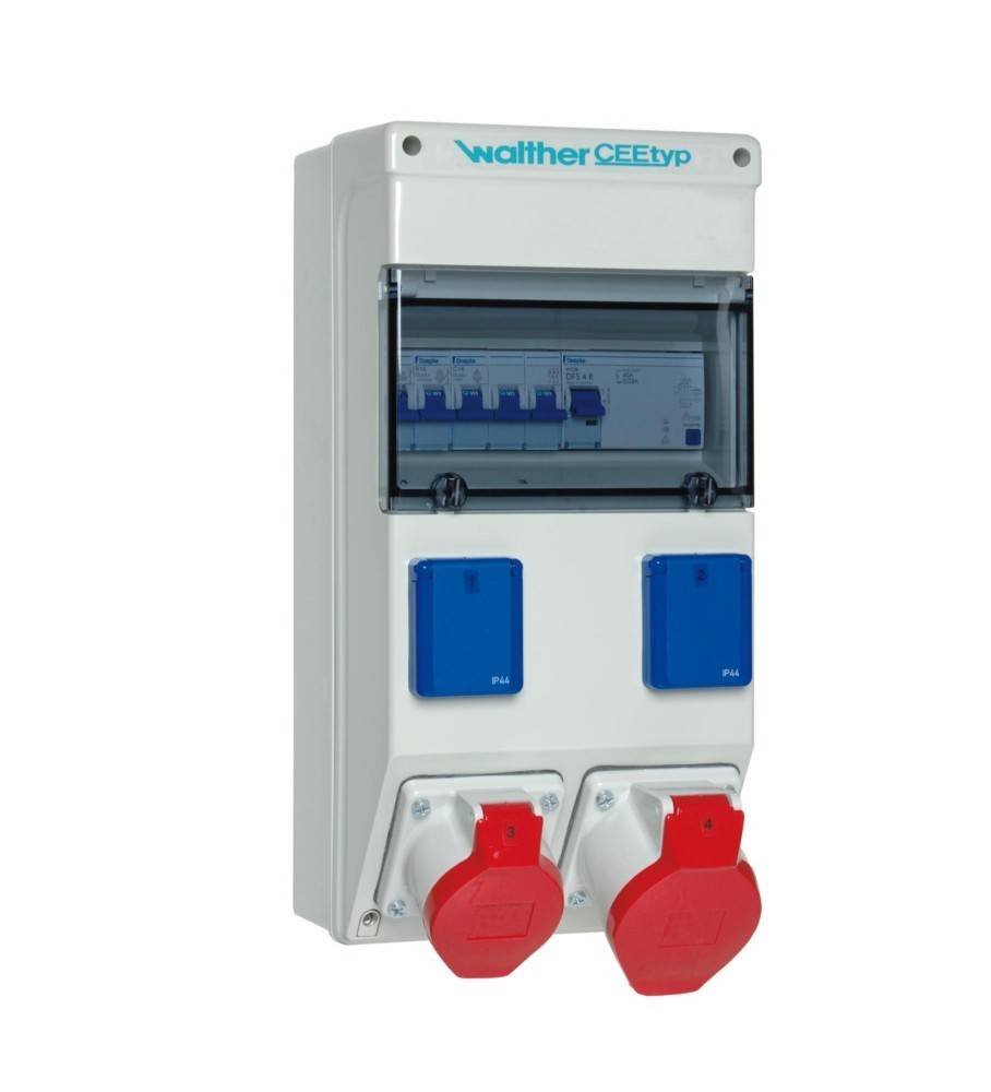 WALTHER Kunststoff-Steckdosenkombinationnach IEC 61439-Teil 1 und 3Gehäuse (698) aus silikon- und halogenfreiem PC/ABS Farbe: ähnlich RAL 7035 -lichtgrau- mit oben einrastendem KlarsichtdeckelSchutzklasse IIBrennbarkeitsklasse V0Schutzart: IP44Größe ca.: 370 x 183 x 152mm / H-B-T Anschluss:2 Vorprägungen oben und unten M25/M32/M401 Klemmsatz K25 10P Abgänge/ Absicherung:1 Fehlerstromschutzschalter (RCD) 4P 40A/30mA -A-1 CEE-Anbaudose gerade 32A 5P 400V 6h1 CEE-Anbaudose gerade 16A 5P 400V 6h mit Leitungsschutzschalter (MCB) 3P 16A -C-2 Schutzkontaktsteckdosen 16A 3P 230V mit je 1 Leitungsschutzschalter (MCB) 1P 16A -C- Steckdosenkombination nach DIN EN 61439:stückgeprüftanschlussfertig verdrahtetBemessungsstrom: 32A