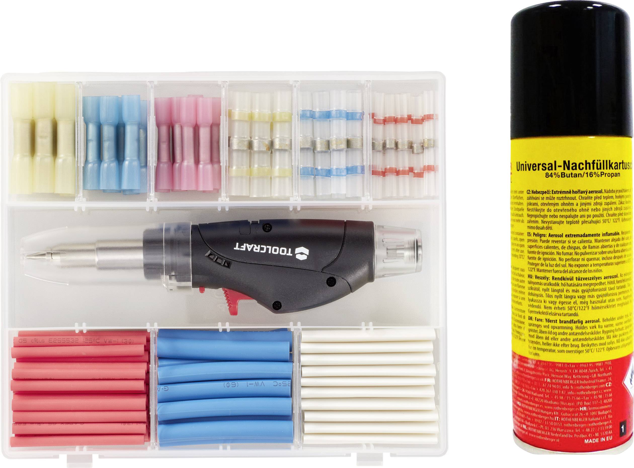 Dieses TOOLCRAFT Schrumpfschlauchset mit Gaskartusche enthält einen Mini-Heißgasbrenner mit einstellbarer Flamme oder flammenloser Wärme mit einer max. Temperatur von 1300 °C.Mit eingebauter Piezo Zündung für Butangas und Gasfüllstandsanzeige über Sichtfenster.