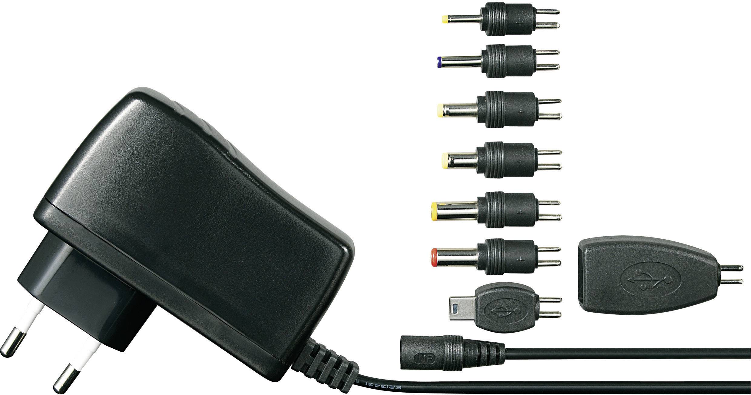 Universell einsetzbares Steckernetzteil mit wechselbaren Ausgangssteckern. Ideal für alle gängigen Multimediageräte und USB-Hubs mit einer Betriebsspannung von 5 V/DC und einer Stromaufnahme bis zu 2500 mA. Verpolungsgeschützte DC-Ausgangsstecker.