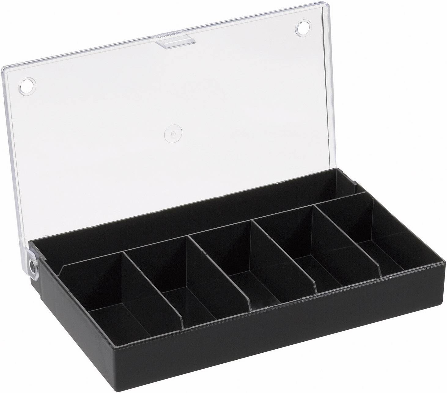 Mit transparentem Kunststoffdeckel, farbigem Boden und Scharnierbefestigung. Zum Sammeln und Aufbewahren von Münzen, Modellen, Bauteilen usw. Stapelbar durch Noppen am Boden.
