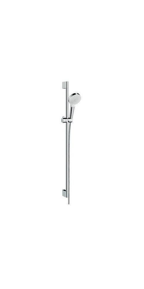 Strahlart Rain · Strahlartenumstellung durch drehbare Strahlscheibe · Brausekopfgröße 100 mm · brauseseitiger Drehwirbel gegen Verdrehen des Brauseschlauches · Neigungswinkel um 90° verstellbar · Schieber schwenkt nach links und rechts sowie oben und unten · vollverchromte Brauseschieber · maximale Durchflussmenge (bei 3 bar) 14 l/min · 22 mm breite Stange · verchromte Wandstütze aus Kunststoff · bestehend aus: Crometta Vario Handbrause · Comfortflex Brauseschlauch 1600 mm · Unica´ Croma Brausestange 650 bzw. 900 mm ohne Brauseschlauch Weitere technische Eigenschaften: · Kennzeichen UBA-Anforderung: Ja · Kennzeichen UBA-Positivliste: Ja · Länge der Duschstange: 959mm · Mit Gleit- und Scharnierstück: Nein · Mit Ringablage: Nein · Mit Schlauch: Ja · Mit Seifenschale: Nein · Verdeckte Befestigung: Ja