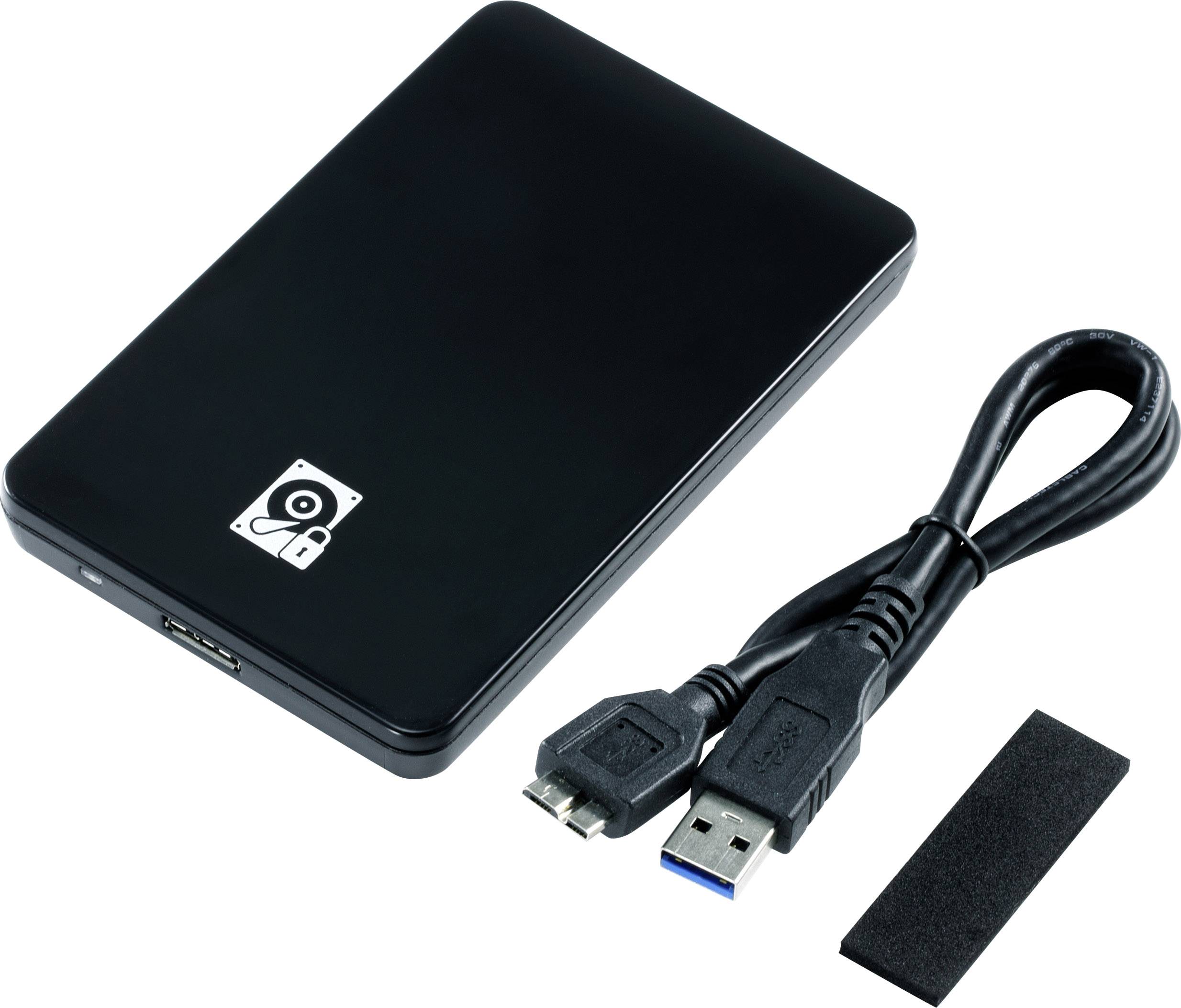 Festplattengehäuse + Anschlusskabel USB 3.0 (Typ A) auf micro USB (Typ B) + Aufkleber mit Passwort + Bedienungsanleitung