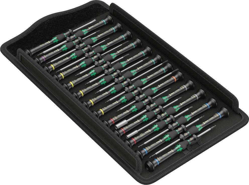 Wera Micro Schraubendreher im Set für feinmechanische Verschraubungen. Durch Abstützen der Hand auf der Drehkappe und durch die Schnelldrehzone unterhalb der Drehkappe ist blitzschnelles Zwirbeln möglich. Zeitintensives Umgreifen entfällt. Aufbewahrung und Transport in robuster Tasche, so ist das Werkzeug immer zur Hand. Mit Werkzeugfinder Take it easy: Farbkennzeichnung nach Profilen und Größenstempelung.