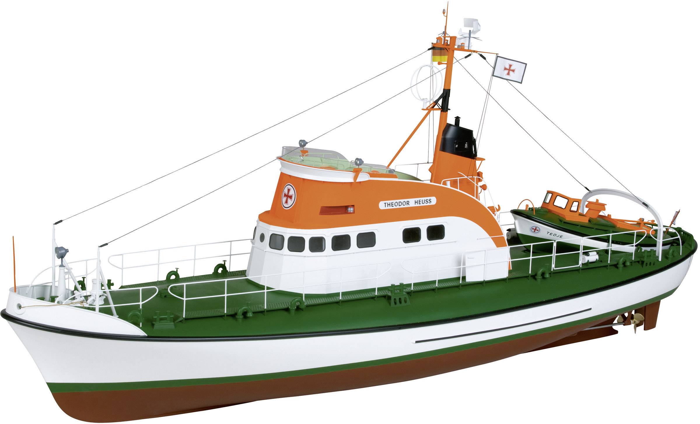 Originalgetreuer Nachbau des ersten Seenotrettungskreuzers der aktuellen Konzeption. Alle folgenden Kreuzer wurden nach diesem Konzept gebaut. Insgesamt wurden von der Theodor Heuss Klasse vier Schiffe gebaut. Der Kreuzer wurde am 12.02.1957 auf den Namen des damaligen Bundespräsidenten Theodor Heuss getauft. Das Tochterboot wurde Tedje, als norddeutsche Verniedlichung des Vornamens Theodor getauft. Dienst tat die Theodor Heuss von 1957 bis 1963 auf Borkum und von 1963 bis 1985 in Laboe. Danach wurde der Kreuzer verkauft und fährt noch heute unter dem Namen Frido Spatz als Yacht. Das Tochterboot befindet sich seit 1996 ebenfalls im privaten Besitz und soll nach der Restaurierung ebenfalls wieder in Fahrt kommen. Vorher stand es als Ausstellungsexponat vor dem Rettungsschuppen in Norddeich. Die Theodor Heuss, die im Deutschen Museum in München liegt, ist das umbenannte Schwesterschiff H. H. Meier. Qualitätsmodell der Spitzenklasse mit hervorragender Detaillierung.