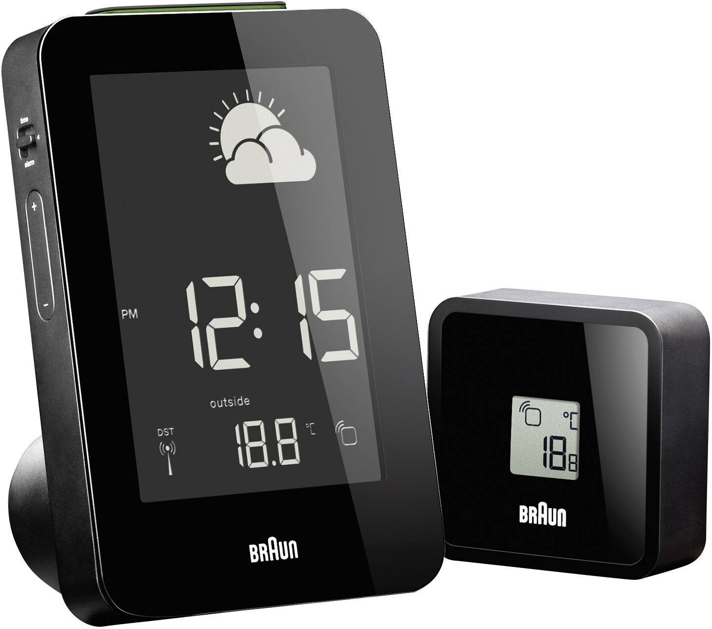 Braun funkgesteuerte Wetterstation mit negativen LCD-Display, Uhrzeit, Weckzeit, Raum- und Außentemperatur sowie Luftfeuchtigkeit und Wettervorhersage für die nächsten 12 - 24 Stunden. Einzigartiger Funktionsmodus zur individuellen Einstellung. Da Schlummerfunktion, Außenfühler mit Temperaturanzeige im Display.