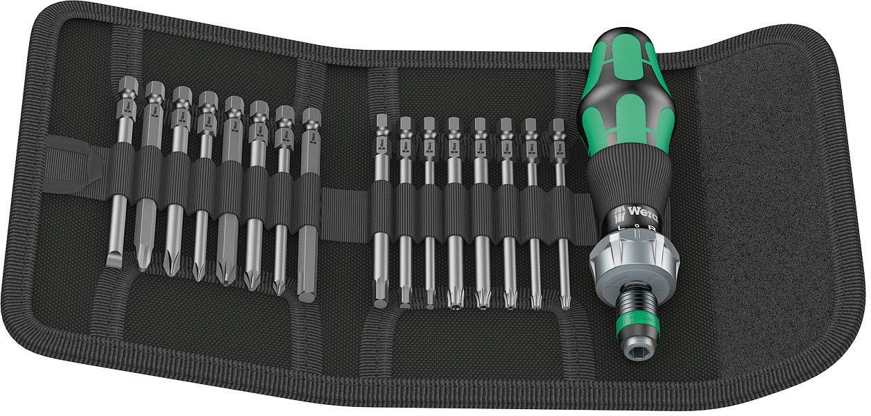 17-teiliges Set mit 89 mm langen Bits in praktischer Falttasche. Mit 1 Handhalter 816 RA Kraftform mit Ratschenfunktion: Feinverzahnung für geringen Rückholwinkel, Umschaltring (rechts, fest, links), maximales Drehmoment von bis zu 50 Newtonmetern. 1/4"-Innensechskantaufnahme mit Rapidaptor-Technologie für ermüdungsarmes Arbeiten und blitzschnellen Bit-Wechsel. Magnetisch.