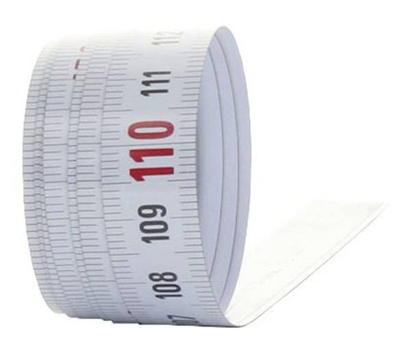 Stahlmaßband mit mm-Teilung, weiß lackiert. Selbstklebend für die Anbringung an vielen Materialen wie Metall, Kunststoff und Holz.
