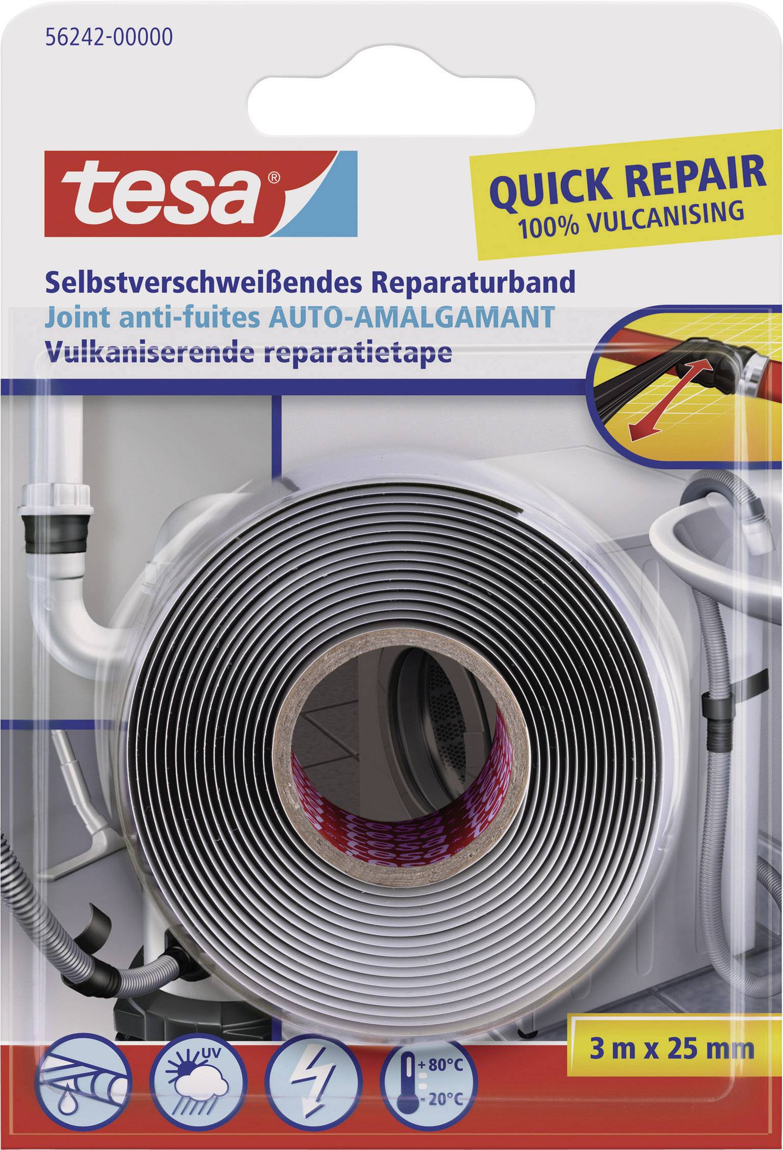 Reparaturband zum kurzfristigen Reparieren, Abdichten und Isolieren. Auch auf nassen Untergründen anwendbar. Wetter- und UV-beständig. Zuverlässig stromisolierend im Haushalt.