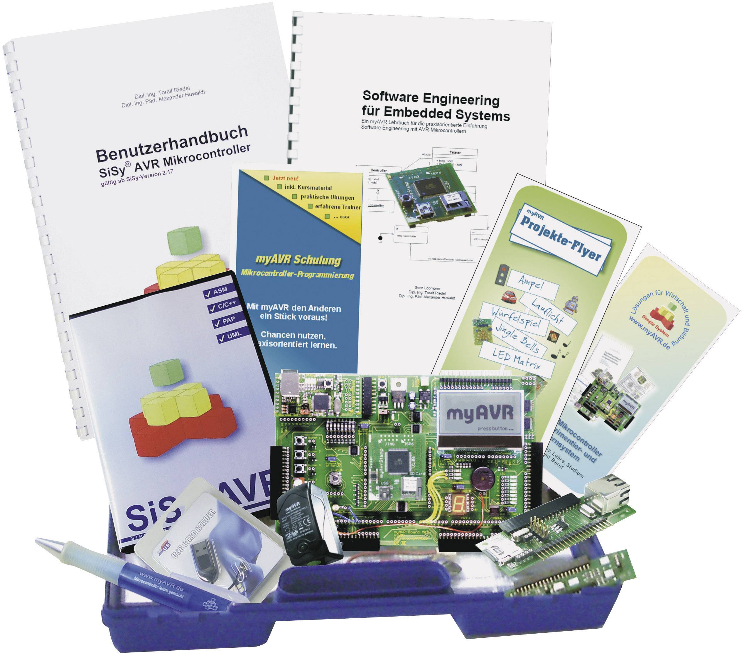 myAVR Board bestückt mit ATmega2560 und Grafik-LCD + Entwicklungsumgebung SiSy AVR mit Benutzerhandbuch + Buch Software Engineering für Embedded Systems + myAVR Netzteil + myEthernet, myColor LED Add-On