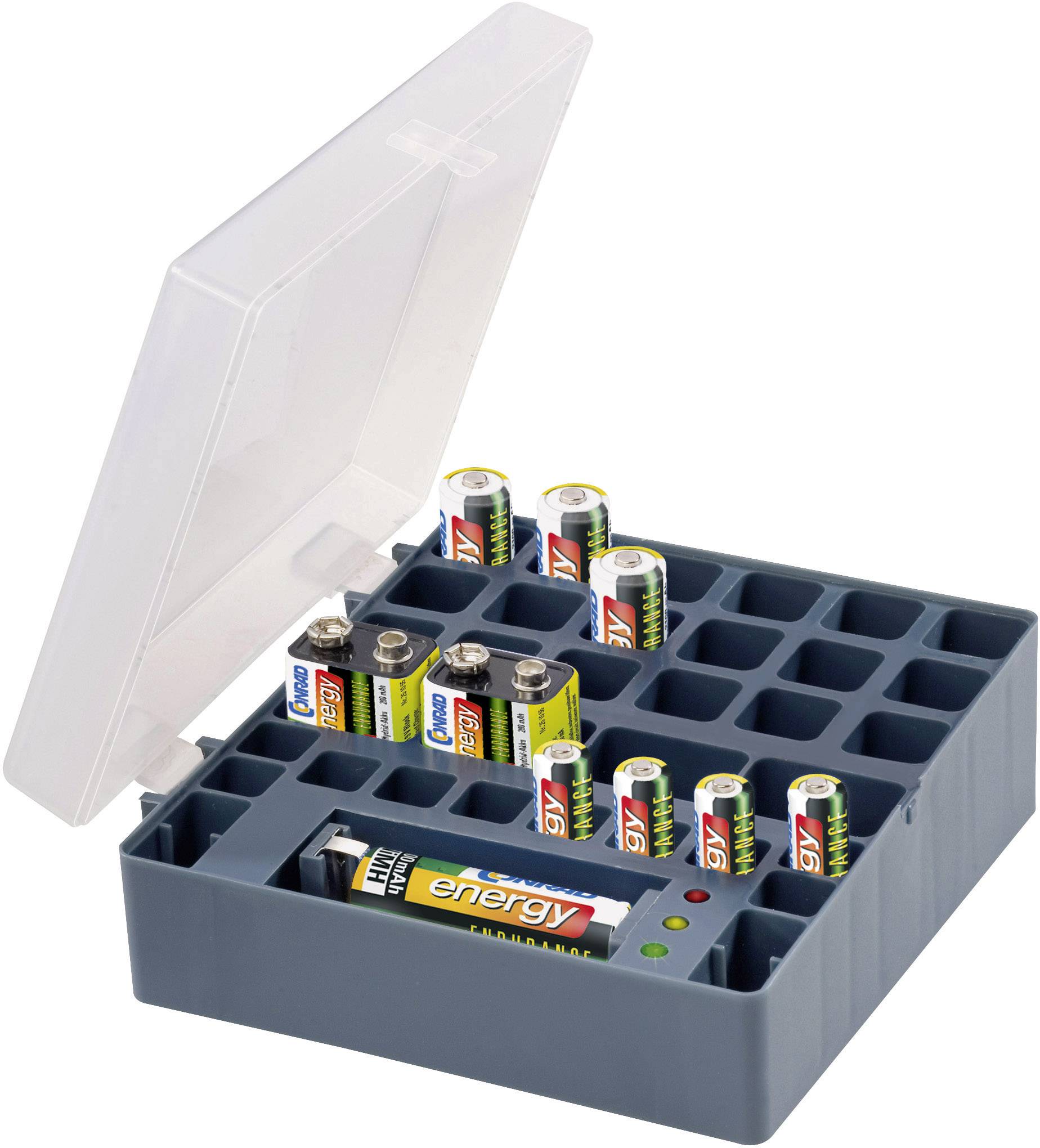 Die praktische Conrad energy Box ist für 36 Batterien oder Akkus ausgelegt. Es können 18x Mignon, 14x Micro und 4x 9 V Block sicher und praktisch verstaut werden. Mit der Conrad energy Box haben Sie Zuhause und auch Unterwegs immer Ihre gängigsten Batterien oder Akkus parat und müssen nicht lange suchen. Sie können die Box auch an der Wand befestigen und durch den stabilen Deckel mit Schnappverschluss sind die Batterien oder Akkus auch vor Staub und Feuchtigkeit geschützt. Der integrierte Batterietester ermöglicht es Ihnen die Kapazität Ihrer Batterien oder Akkus zu kontrollieren. Somit können Sie die Kapazitäten voll ausnutzen und es werden keine Batterien mehr halbvoll entsorgt. Tip: Um einen besseren Überblick zu haben, empfehlen wir die leeren Batterien oder Akkus umgedreht in die Box zu stecken.