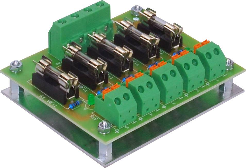 5-fach abgesicherter Verteiler in Hutschiene. 5 einzeln abgesicherte Ausgänge für Verbraucher bis 40 V geeignet. Bis 5A belastbar.