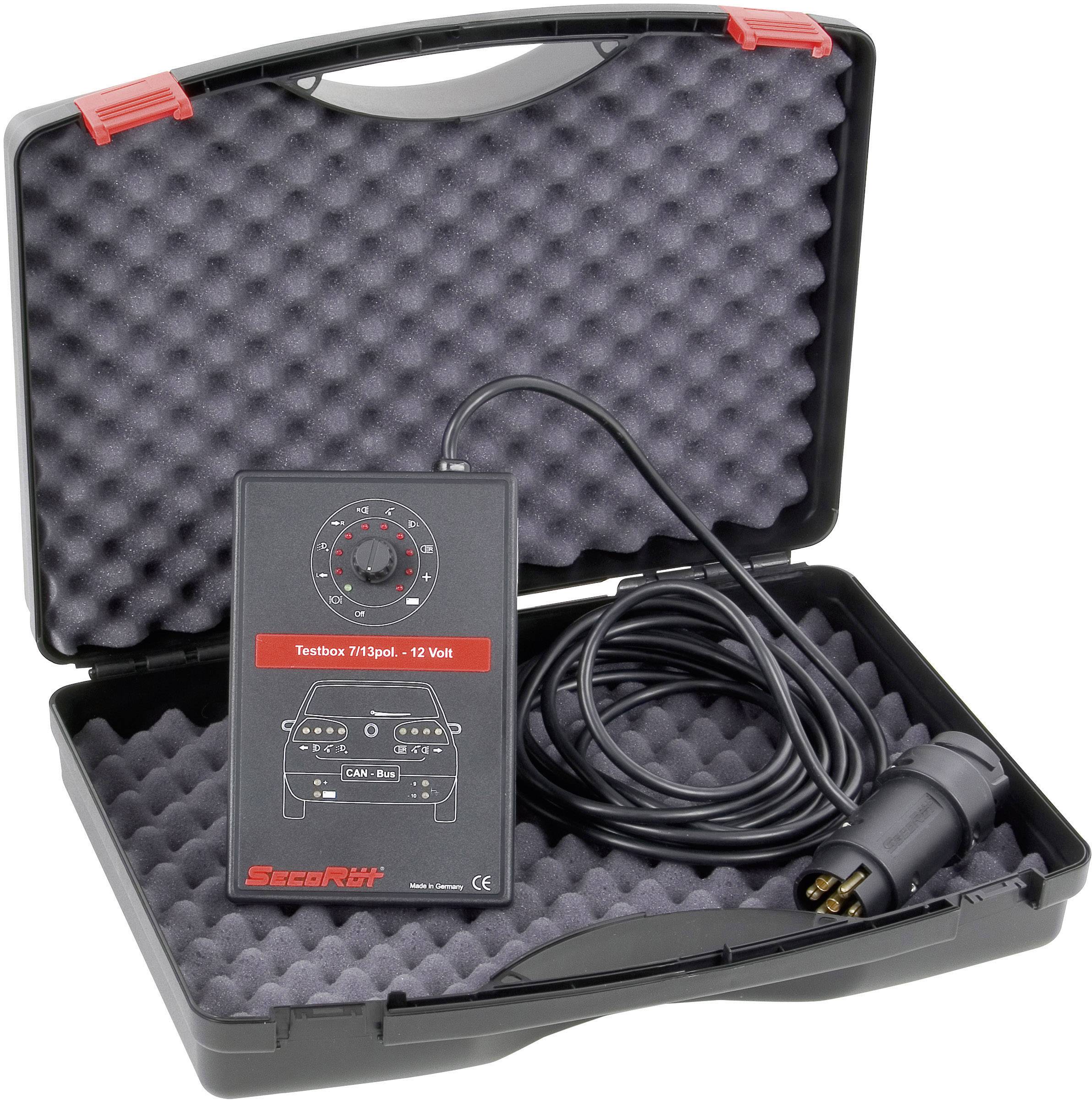 Mit dieser Prüfbox werden Verkabelung/Anschlüsse der Anhängersteckdosen am Fahrzeug/PKW sowie Anhänger überprüft und kontrolliert. Eine Neuheit ist auch die optische Anzeige der Minusleitungen der Anhängersteckdose 13polig (Es müssen 3 Minusleitungen angeschlossen sein). Hier wird dem Benutzer zusätzlich die Möglichkeit gegeben, die Anschlüsse der Minusleitungen 9 und 10 der Fahrzeugsteckdose zu prüfen. Die Prüfbox ist mit einem ca. 5 Meter langem Kabel und Kombistecker 7/13polig für die Anwendung durch eine Person ausgestattet. Die Lieferung erfolgt in einem Kunststoff-Schalenkoffer.