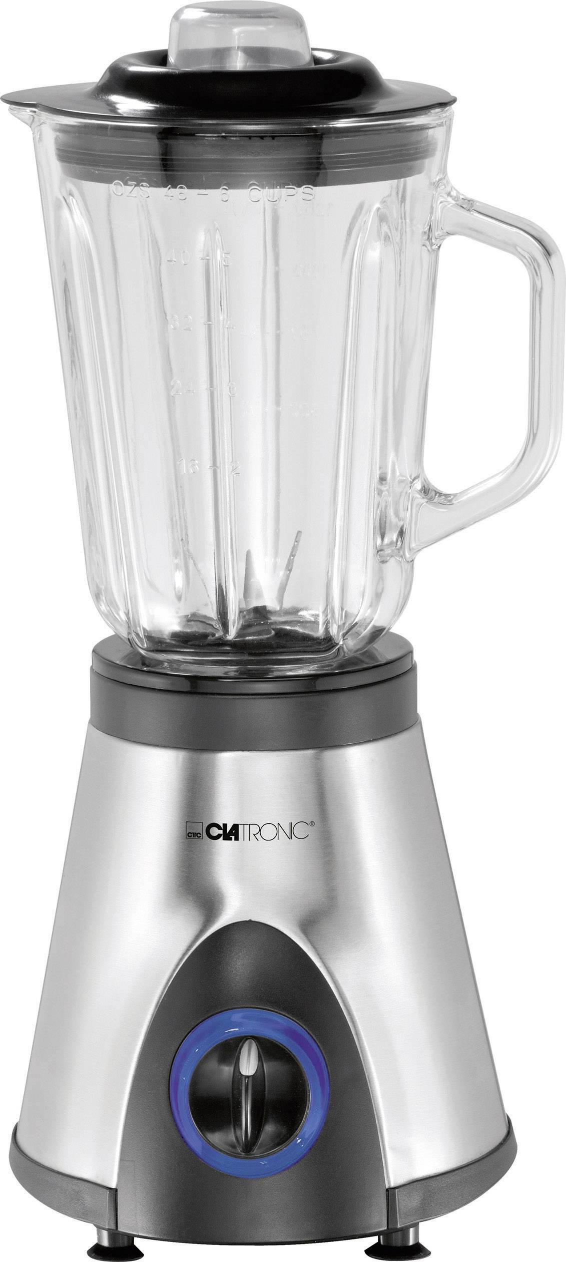 Deckel mit Nachfüllöffnung (Ø ca. 50 mm) · Abedckung für Nachfüllöffnung auch als Messbecher verwendbar (2 cl) · Kraftvoller 550-Watt-max.-Motor · Blau beleuchteter Drehschalter · Abnehmbarer Mixbehälter aus massivem Glas mit 1,5 Liter Fassungsvermögen (mit Skala) · 6-fach Edelstahlmesser, rostfrei · Sicherheitsschaltung - Betrieb nur mit aufgesetztem Behälter möglich · Kabelstaufach am Bodenteil · Alle Zubehörteile spülmaschinengeeignet · Messerblock zur Reinigung abnehmbar · Sicherer Stand durch gummierte Füße · Spannungsversorgung: 230 V, 50 Hz · Leistungsaufnahme: 550 W max.