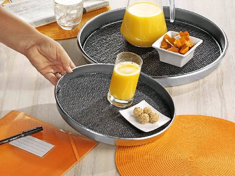 Serviertablett SAFE rund, 29 cm, aus Edelstahl, Höhe 2,5 cm, mit herausnehmbarer Antirutscheinlage (bis 60 Grad waschbar)