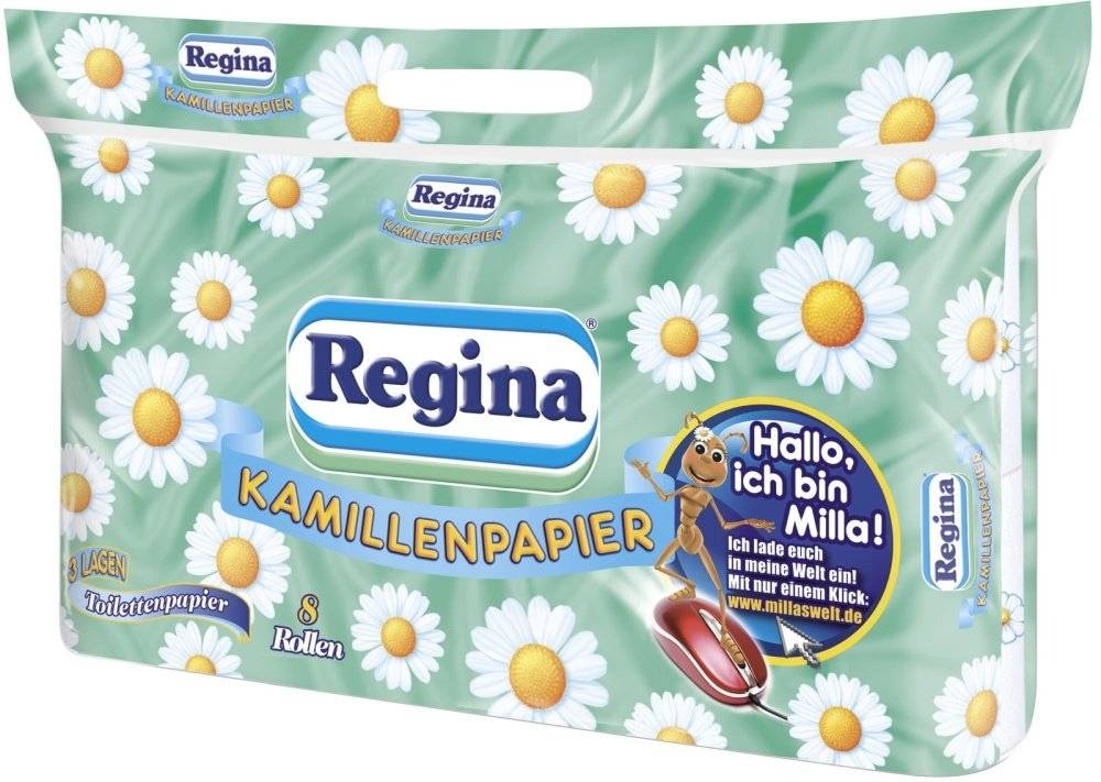 REGINA Toilettenpapier mit Kamillenduft 3-lagig mit 150 Blatt pro Rolle Inhalt: 8 RollenMit außergewöhlicher Weichheit aus 100 reinem Frischzellstoff.