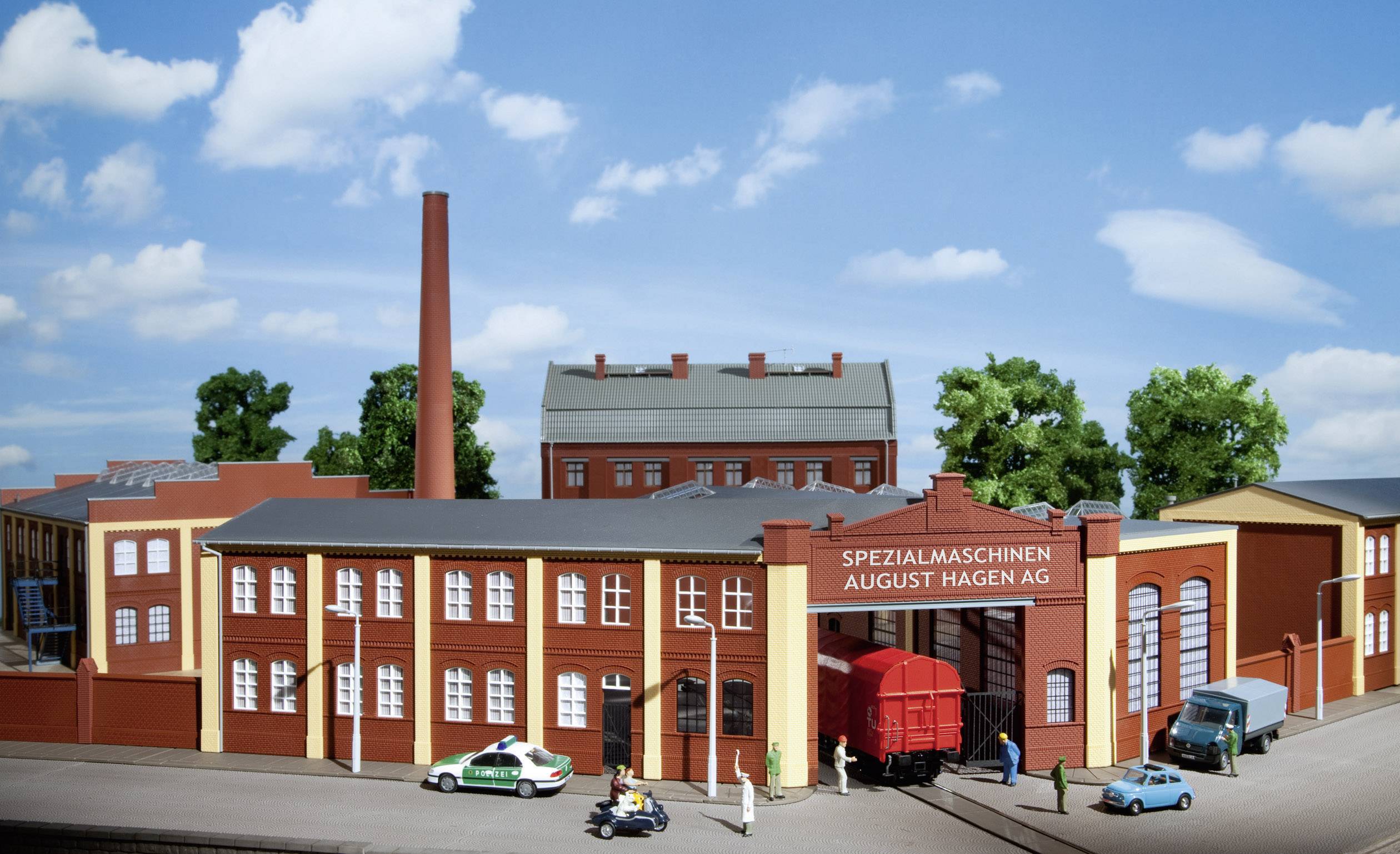 Das Portal ist ohne jeden Schnörkel, der Eingangsbereich aber praktischerweise überdacht, die Unterkonstruktion ist gut sichtbar. Mit einem schmiedeeisernen Tor, das sehr filigran aus durchgefärbtem Karton gelasert ist, kann der Eingang geschlossen werden. Rechts wurde eine kleine Werkhalle und links ein zweigeschossiges Produktionsgebäude angebaut. Die Be- und Entladung der Waggons erfolgt im Innenhof oder in der Werkhalle Best.-Nr. W04758 . Die Idee zur Gestaltung des Werktores lieferte zum Teil der ehemalige Waggonbau Görlitz.