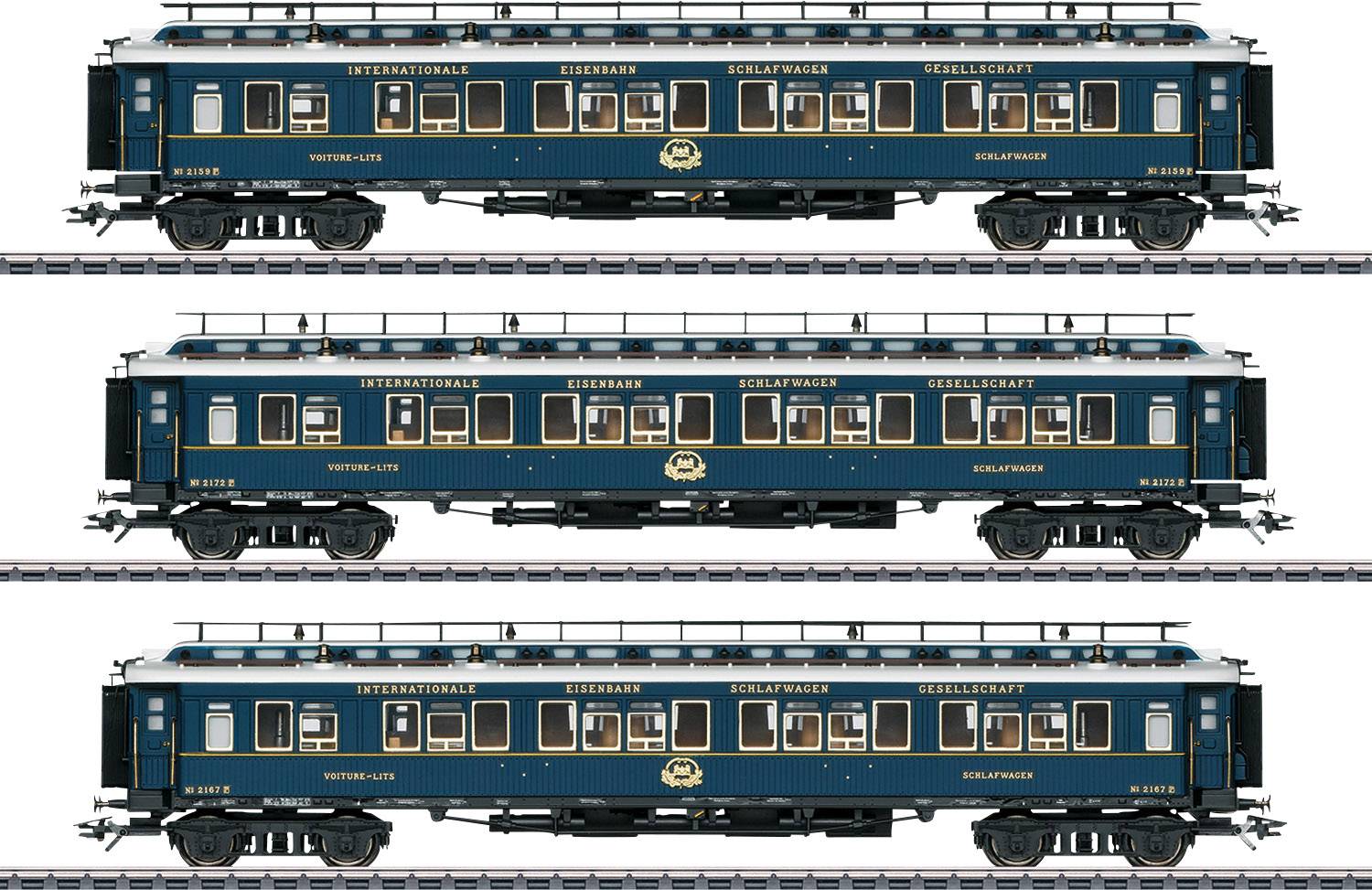 3 verschiedene vierachsige Schlafwagen, in der Ausführung der Compagnie Internationale des Wagons-Lits et des Grands Express Européens (CIWL), für den Simplon-Orient-Express. Jeweils in stahlblauer Farbgebung. Zustand Anfang der 1930er-Jahre.