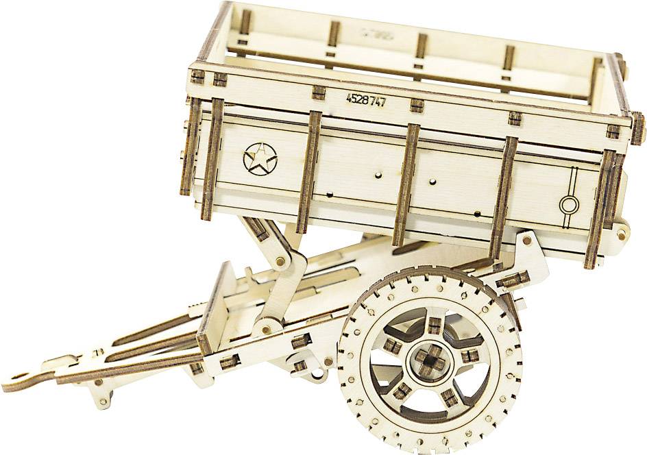 Ergänze Deinen Wooden City Jeep 4×4 jetzt mit dem detailreichen Militäranhänger. Gefederte Achse. Ein spezieller Hebel ermöglicht das Kippen der Ladefläche, die hintere Ladeklappe kann außerdem geöffnet werden. Ein abnehmbarer Reservekanister als Zubehör gibt dem Anhänger den letzten Pfiff. Der Anhänger verfügt über eine Kupplung und kann so ganz einfach an den Jeep 4x4 angekoppelt werden.