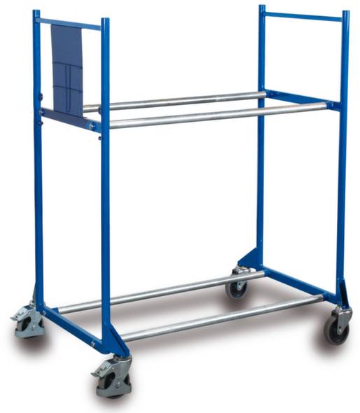 Reifenwagen - Traglast 300 kg Etagen: - 2 Etagen zur Aufnahme von je 4 Reifen bis zu einer Breite von 275 mm - Verzinkte Verbindungsrohre mit Verschraubung, dadurch in der Breite variabel. Gestell: - Geschweißte Stahlkonstruktion - Oberfläche pulverbeschichtet - Dauerhaft oberflächengeschützt, schlag- und kratzfest - Für Raddurchmesser 540 - 820 mm. Bereifung: - 2 Lenkrollen, 2 Bockrollen - Lenkrollen mit Feststellern und Fußschutz.