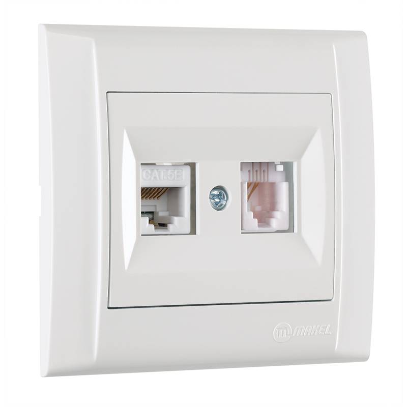 Defne Doppel Netzwerkdose Cat 3 + Cat 5 + Rahmen, VDE Zertifiziert, Unterputz, in weiß