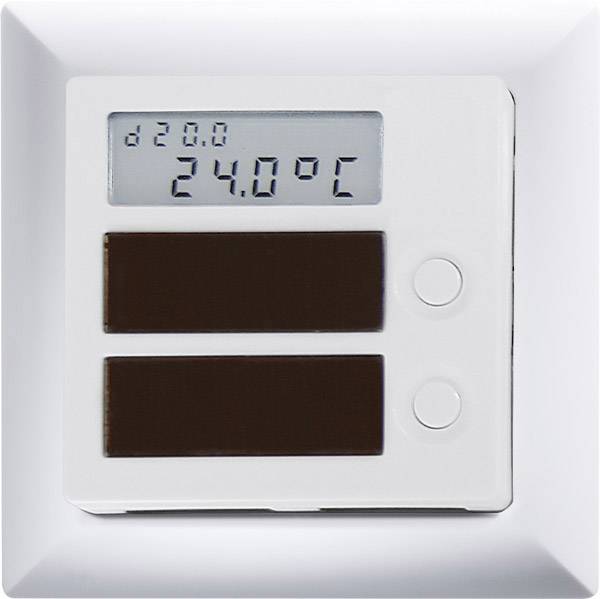 Funk-Temperaturregler mit Display reinweiß glänzend für Einzel-Montage 80x80x22mm oder Montage in das 55er-Schaltersystem. Mit Solarzellen und Batterie (Lebensdauer 3-5 Jahre). Smart Home Sensor. Alternativ kann die Stromversorgung mit einem 12V DC-Schaltnetzteil SNT61-12V/6W in einer UP-Dose hinter dem Sensor erfolgen. Wird das Anschlusskabel nicht benötigt, kann es abgeschnitten werden. Dadurch benötigt der Sensor keine Einbautiefe hinter der Halteplatte und er kann auf jeder ebenen Fläche angeschraubt werden. Zur Schraubbefestigung empfehlen wir Edelstahl-Senkschrauben 2,9x25mm, DIN 7982 C. Sowohl mit Dübeln 5x25mm als auch auf 55mm-Schalterdosen. Je 2 Stück Edelstahl-Senkschrauben 2,9x25mm und Dübel 5x25mm liegen bei. Der Sensor sendet alle 100 Sekunden bei einer Ist-Temperaturänderung von mind. 0,3ºC eine Meldung in den Eltako-Gebäudefunk und das bistabile Display wird aktualisiert. Eine Änderung der Soll-Temperatur wird sofort gesendet und das Display wird aktualisiert. Erfolgt keine Änderung, so wird ca. alle 17 Minuten eine Statusmeldung gesendet. Die Messgenauigkeit beträgt ca. 1°C. Montage: Halteplatte inklusive Elektronik anschrauben. Danach den Rahmen aufrasten, die Batterieisolierung herausziehen, die Frontplatte inklusive Display und Solarzellen aufstecken. Normalanzeige: Im Display oben wird klein die voreingestellte Tages-Solltemperatur von 20°C mit einem davorstehenden d (= day) angezeigt und im Display unten wird groß die Ist-Temperatur z.B. 21,5ºC angezeigt. Die Tages-Solltemperatur wird zwischen +8°C und +40°C mit den beiden Tasten Pfeil oben und Pfeil unten in 0,5°C-Schritten eingestellt. Mehrere Tastenbetätigungen werden aufsummiert. Nach ca. 2 Sekunden wird die neue Solltemperatur groß im Display gezeigt. Nach weiteren 6 Sekunden kehrt das Display zur Normalanzeige zurück. Eine Nachtabsenkung kann ebenfalls mit den Tasten Pfeil oben und Pfeil unten aktiviert sowie eingestellt werden. Sie wird aktiviert durch eine kurze und gleichzeitige Betätigung der Tasten. Oben im Display wird danach klein die Nacht-Solltemperatur mit einem davorstehenden n (= night) angezeigt. Voreingestellt ist ein Wert, welcher 4°C niedriger ist, als die Tages-Solltemperatur. Die Nachtabsenkung wird beendet, indem die beiden Tasten wieder kurz und gleichzeitig betätigt werden. Solange die Nachtabsenkung aktiviert ist, kann die Temperaturabsenkung mit den Tasten Pfeil oben und Pfeil unten in 1°C-Schritten verändert werden. Auch hier werden mehrere Tastenbetätigungen aufsummiert und nach ca. 2 Sekunden wird der neue Wert der Temperaturabsenkung groß im Display gezeigt. Nach ca. weiteren 6 Sekunden kehrt das Display zur Anzeige der Nachtabsenkung zurück. Die Nachtabsenkung wird beendet, indem die beiden Tasten wieder kurz und gleichzeitig betätigt werden. Energiespeicher bzw. Batterie leer: Sinkt der Energiespeicher bzw. die Batteriespannung unter 2,7V wird LoAd im Display angezeigt. Zum Wechseln der 3V-Konpfzelle CR2032 muss lediglich die Frontplatte inklusive Display und Solarzellen abgezogen werden. Nach dem Batteriewechsel die Frontplatte inklusive Display und Solarzellen aufstecken. Der Funksensor kann in nachstehende Aktoren und in die Gebäudefunk-Visualisierungs- und Steuerungs-Software eingelernt werden: FAE14, FHK14, F4HK14, F2L14, FHK61, FME14.