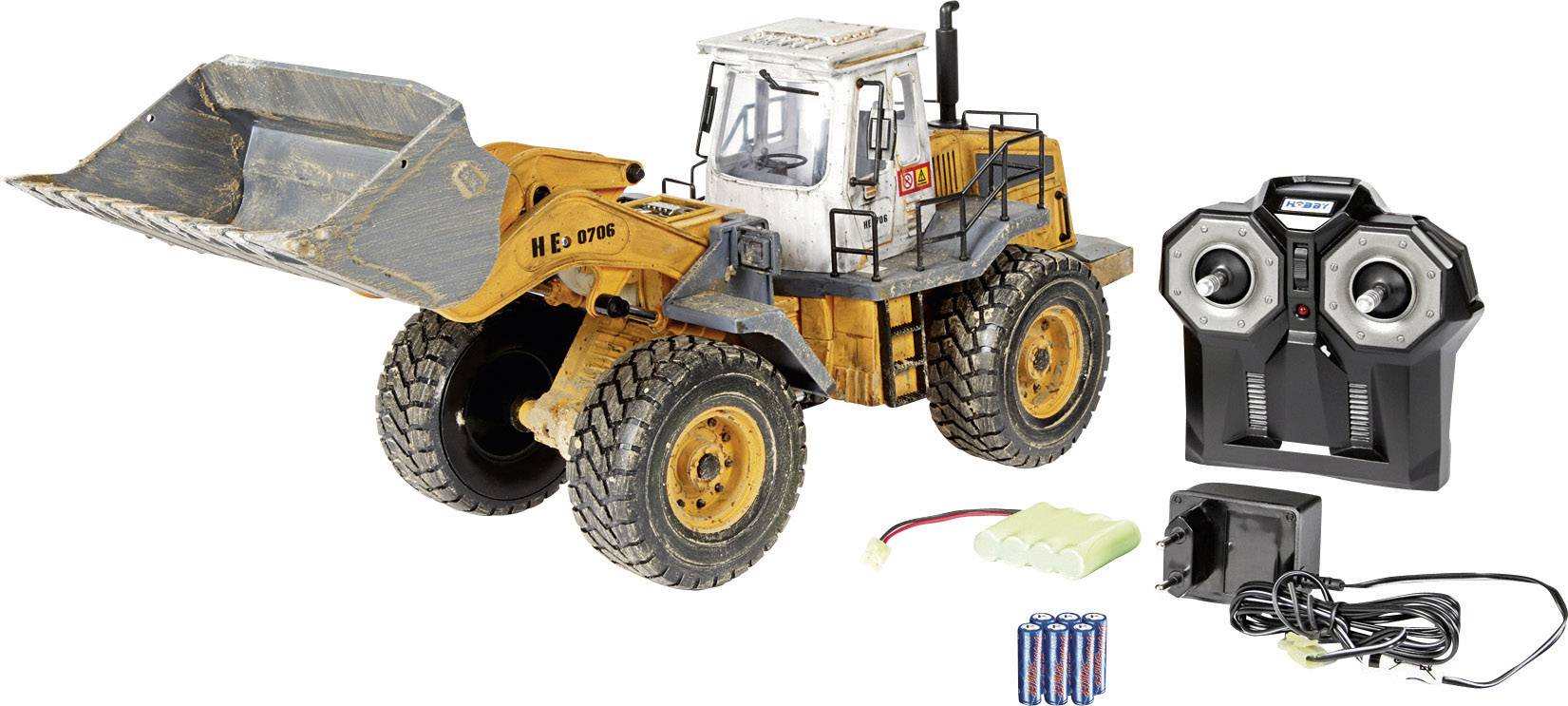 Der Radlader aus der Hobby Line ist absolut vorbildgetreu und voll funktionsfähig, Front- und Rücklichter sind mit LEDs bestückt. Dank Airbrush-Lackierung zeigt der Lader im Maßstab 1:14 arbeitstypische Verschmutzungen aus dem Baustelleneinsatz. Kräftige Elektromotoren und Gummireifen sorgen für Vortrieb im schweren Gelände, senken und heben den Schaufelarm oder kippen die Schaufel. Bis zu 600 g schweres Baumaterial kann der Lader heben. Die störungsfreie 2,4 GHz Fernsteuerung steuert alle Funktionen des Radladers proportional.